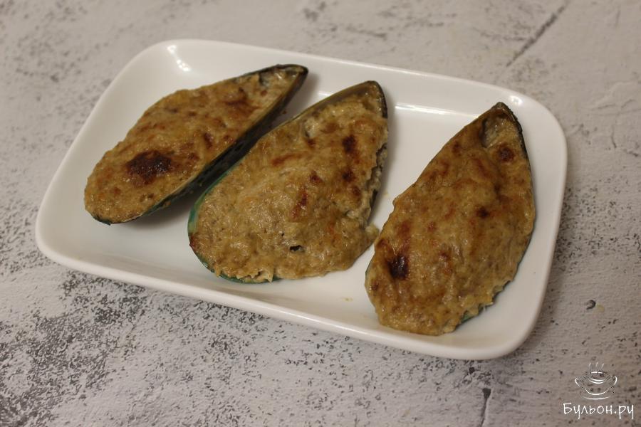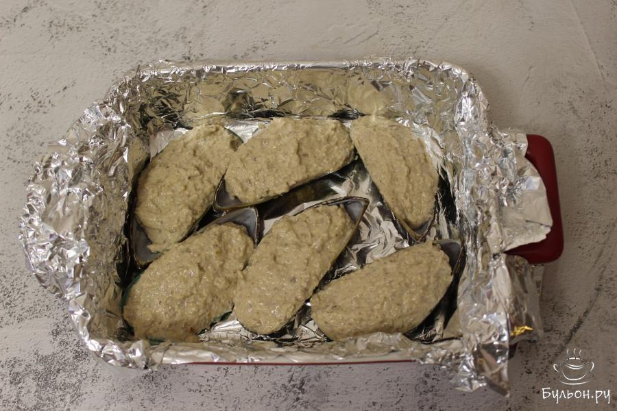 4. Мясо мидий выложите обратно в створки, сверху выложите грибной соус. Форму для запекания застелите фольгой и расположите на фольге подготовленные мидии.