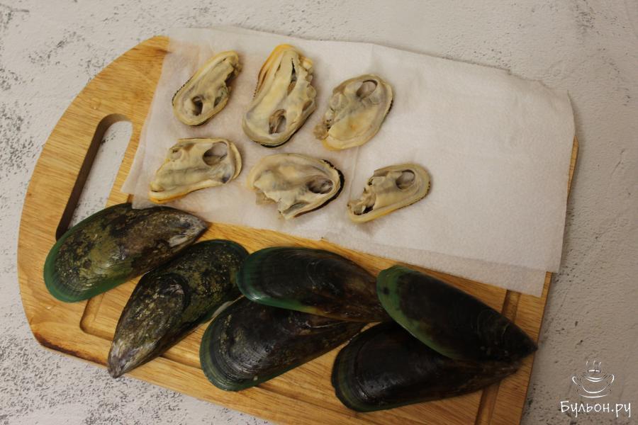 1. Замороженные мидии разморозьте на нижней полке холодильника. Когда мидии будут разморожены, аккуратно отделите мясо от створок, удалите желудочки и мышцы мидий, а сами раковины тщательно промойте.