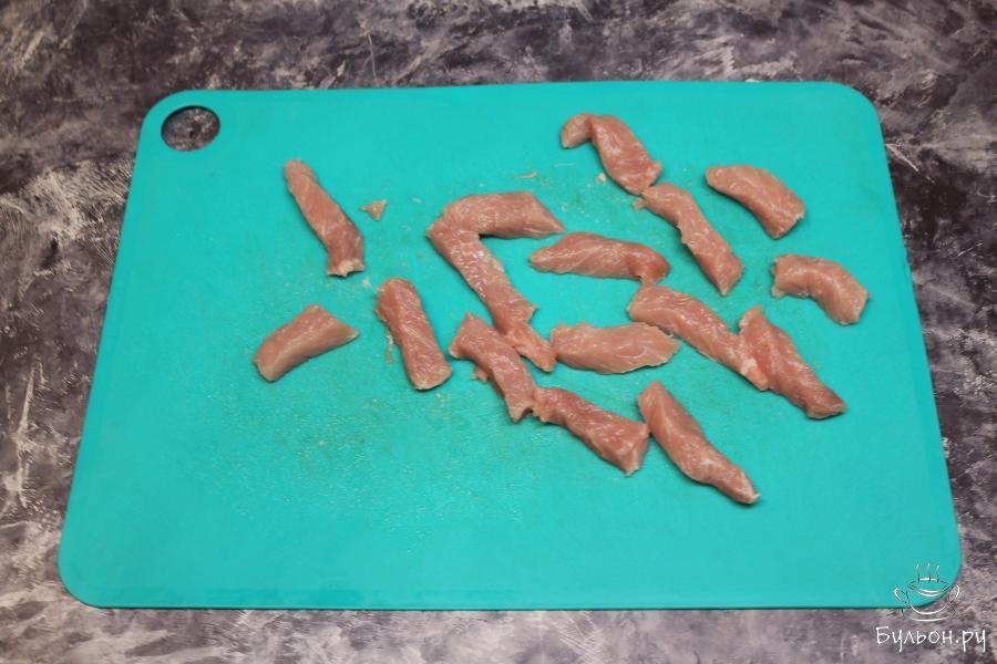 2. Свинину нарежьте на продолговатые кусочки. У меня их 16 штук. Обжарьте их на растительном масле, но не сильно, в конце подсолите свинину.
