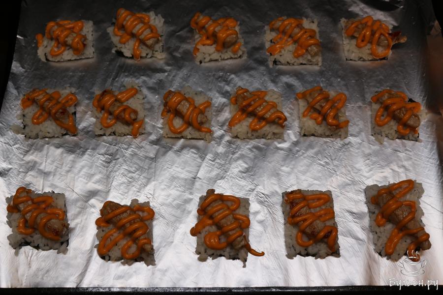4. На каждый квадратик выложите кусочки курицы, сверху смажьте спайси соусом. Подготовленную закуску выложите на противень, застеленный фольгой. Запекайте на режиме гриль в течение 10 минут.