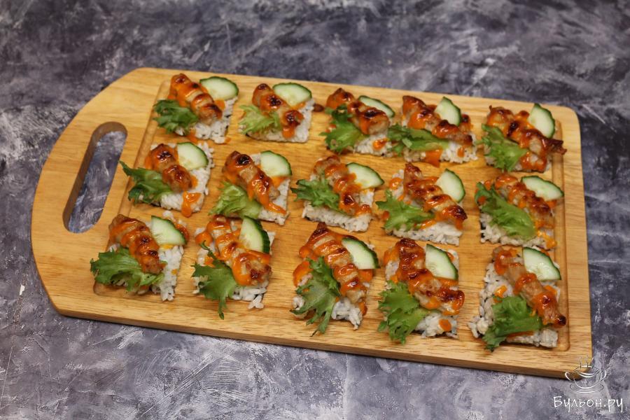 Для всех любителей рецептов по японским мотивам, предлагаю приготовить очень необычную закуску с рисом и курицей на нори. Ее можно назвать закуской для ленивых, то есть для тех, кто любит роллы и гунканы, но не хочет тратить много сил и энергии. Также как и роллы, закуску можно интерпретировать и приготовить с любыми начинками и под любыми соусами. К закуске также можно подать и другой соус, например: соевый, терияки, кунжутный и другие - по вашему усмотрению.