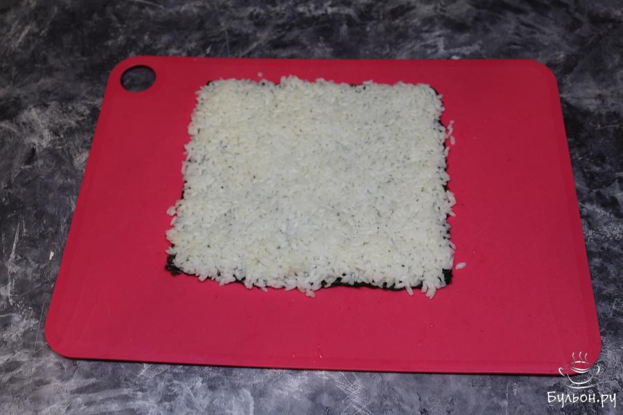 3. Выложите лист нори глянцевой стороной вниз. Затем, равномерным слоем распределите по листу рис, нарежьте теперь все это на 16 квадратиков.
