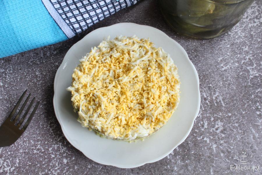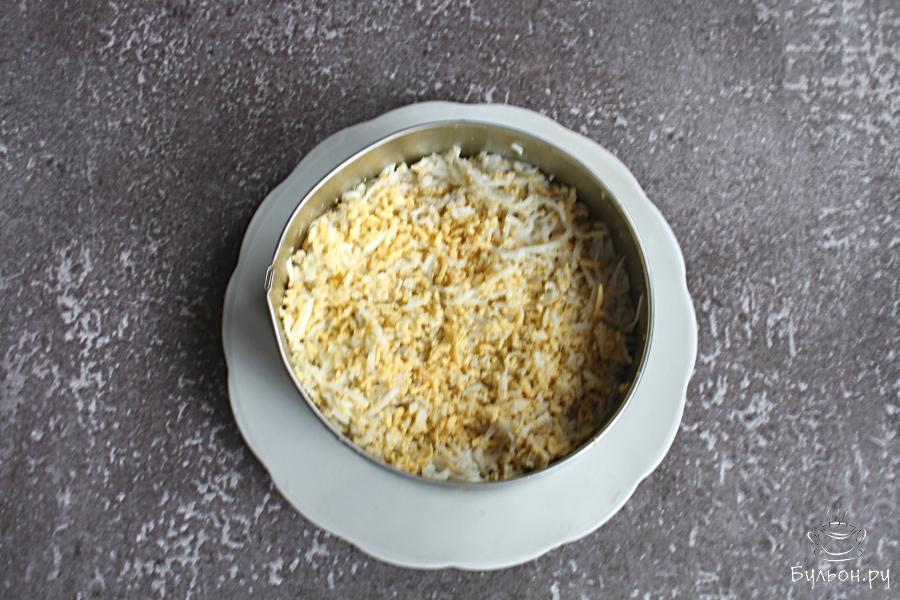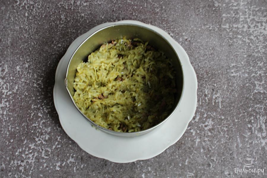 2. Кулинарное кольцо поставить на тарелку. Картошку перекрутить через мясорубку и выложить первым слоем. Смазать этот слой майонезом.