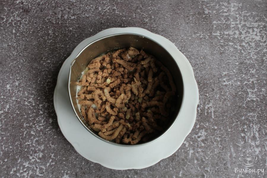 3. Печенку почистить от пленок, нарезать крупно печенку и сварить до готовности, варить 35-40 минут. Перекрутить печень через мясорубку и выложить вторым слоем. Посолить слой и по желанию смазать майонезом.