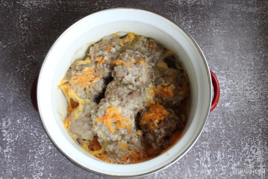 5. Морковь почистить, промыть и натереть через крупную терку. Выложить морковь в кастрюлю, вылить оставшуюся воду и немного посолить.