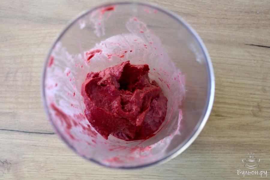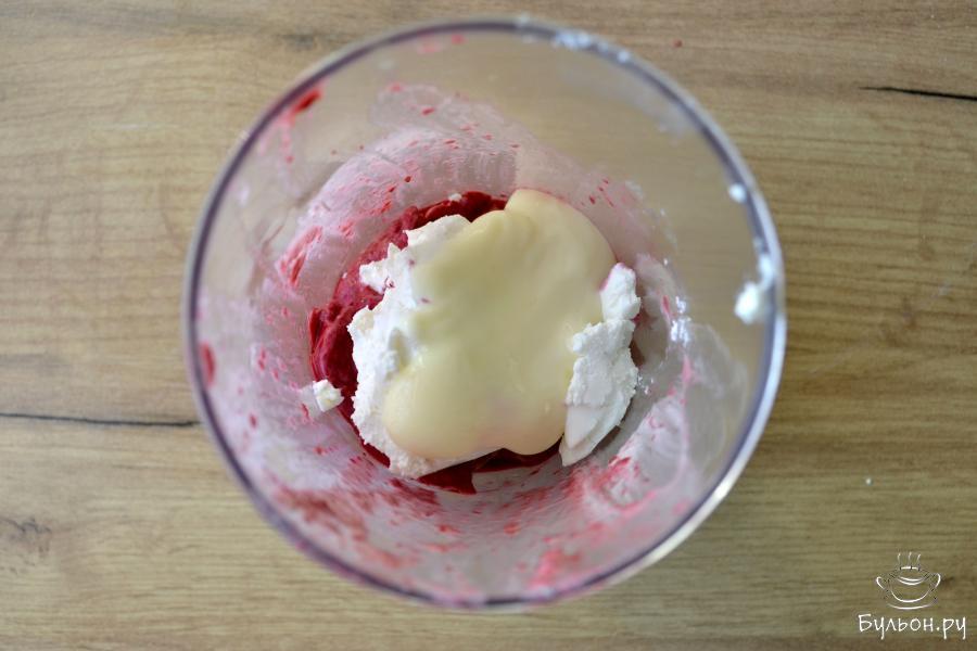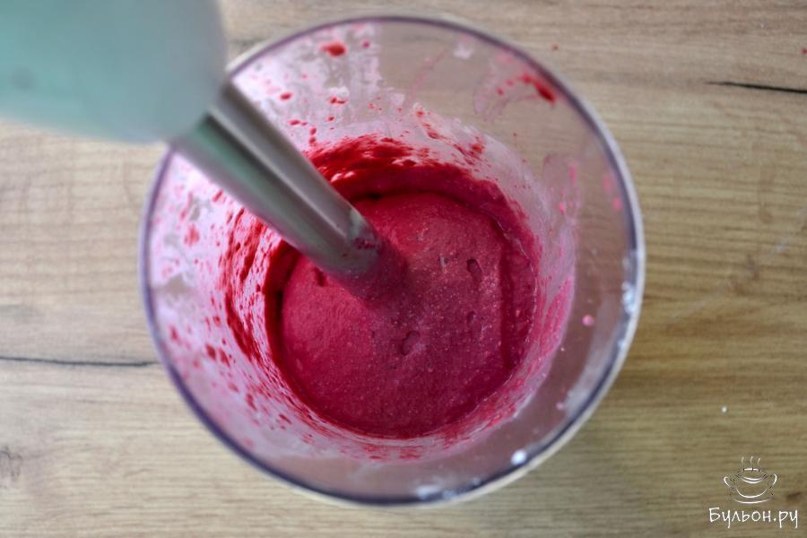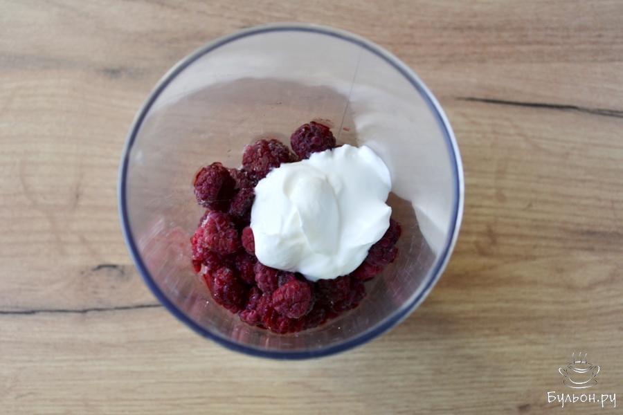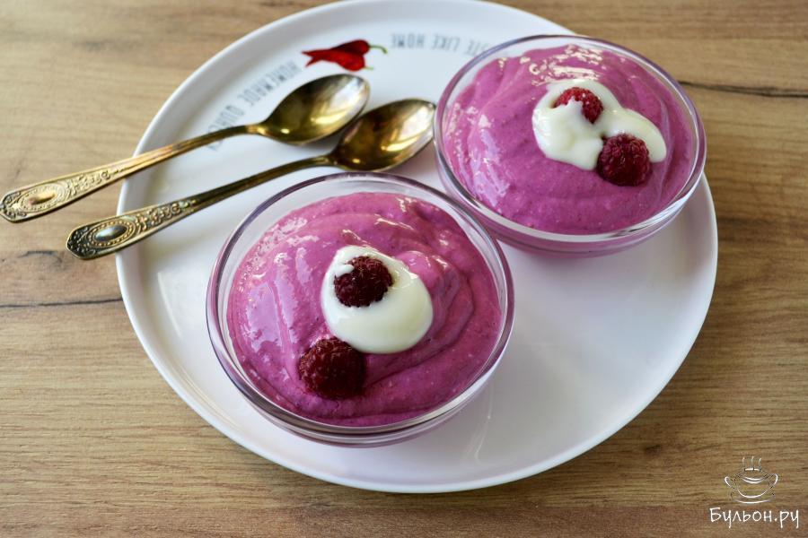 6. Сразу же разложите десерт в креманки и украсьте по-желанию. Можно чуть полить сгущенным молоком и целыми ягодами малины. Приятного аппетита!