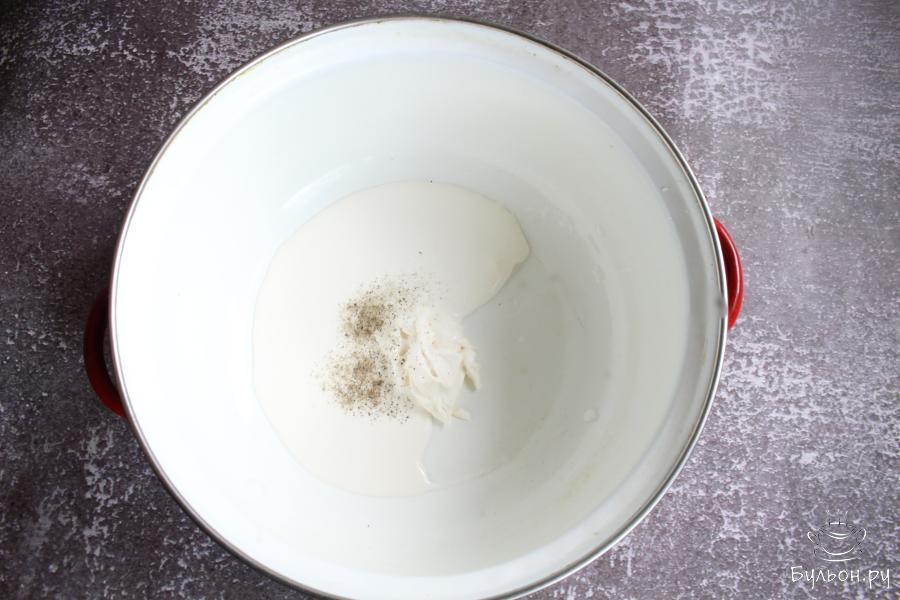 3. В посуду, в который будете готовить блюдо, выложить сметану, влить молоко или воду. Добавить соль по вкусу и черный перец. Перемешать.