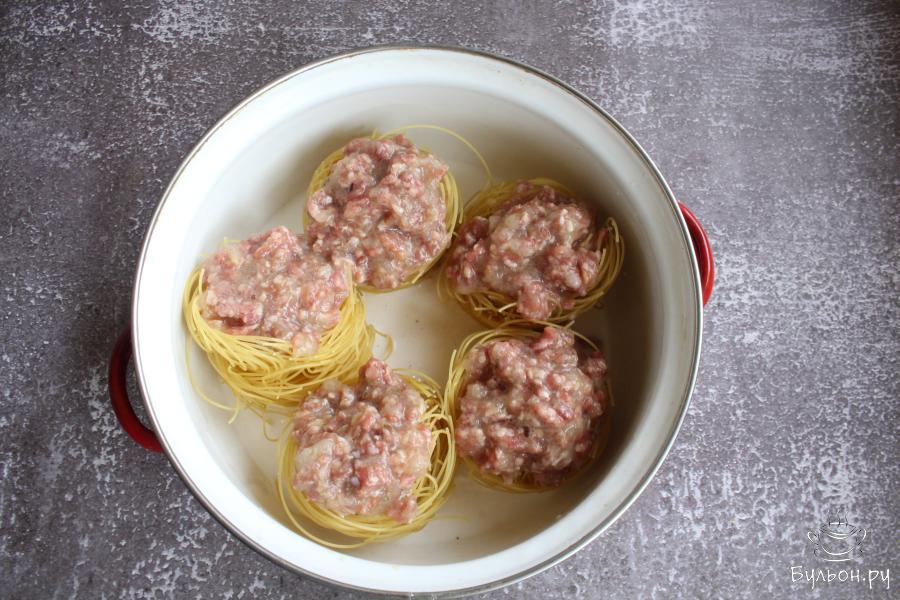 Гнезда с фаршем в сливочном соусе по-итальянски - это замечательно аппетитное блюдо, которое порадует вас своим вкусом. Блюдо получается нежное, мягкое, пропитанное и сытное. Блюдо готовится очень просто и быстро. Если вы любите макароны, обязательно попробуйте хоть раз приготовить их по этому рецепту. Ароматные травы в фарш добавляйте по своему вкусу, те, которые вы любите. Сливочный соус можно готовить как на молоке, так и на воде.