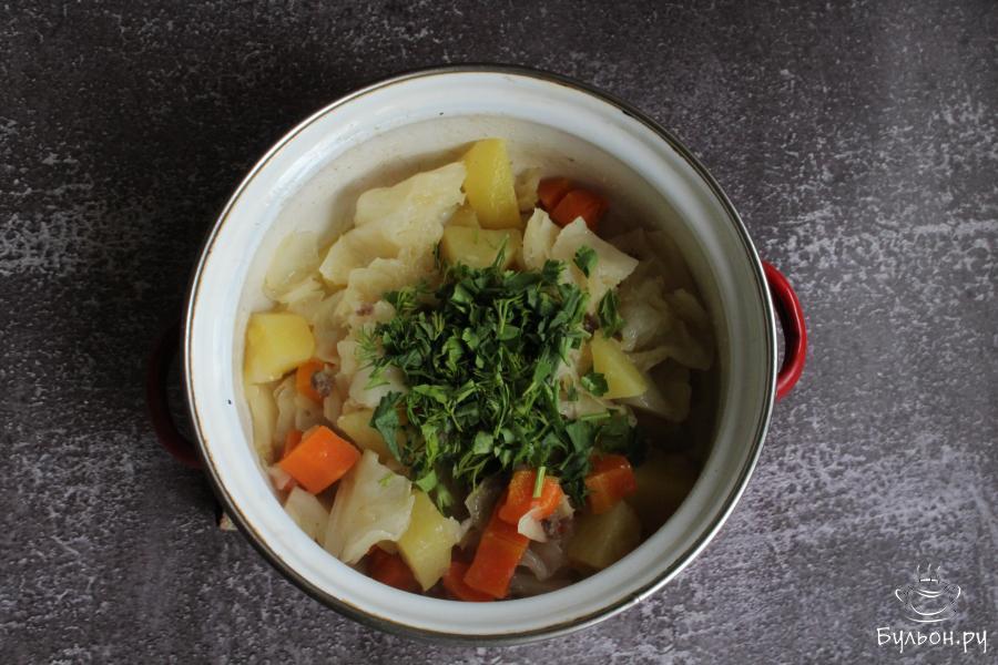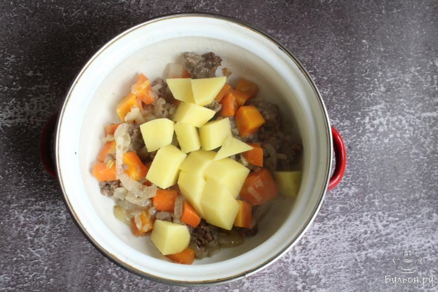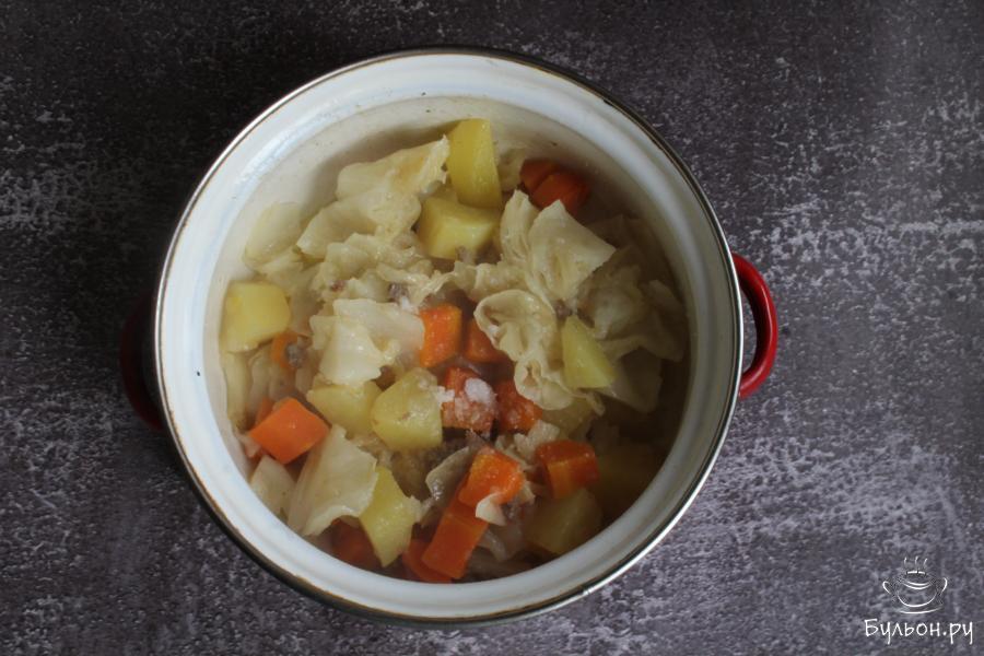 4. Капусту нарезать квадратиками и тоже добавить в кастрюлю. Добавить воду, накрыть посуду крышкой и тушить блюдо 20 минут.