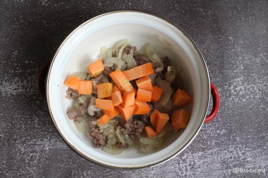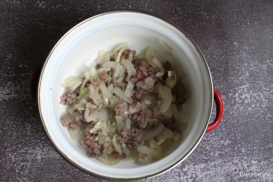 1. Овощи почистить и промыть. Лук мелко нарезать и выложить с фаршем в кастрюлю. Добавить масло. Тушить фарш с луком 5 минут, помешивать.