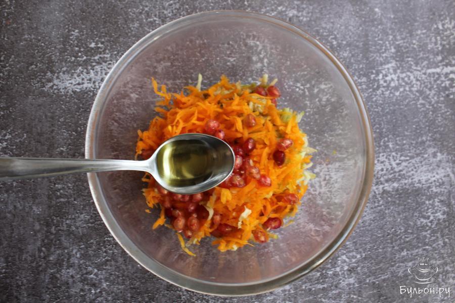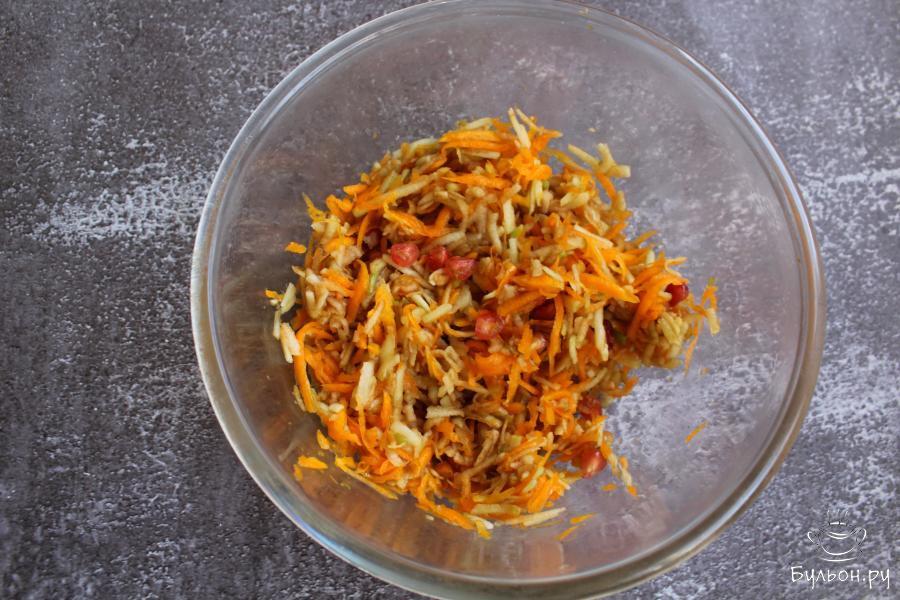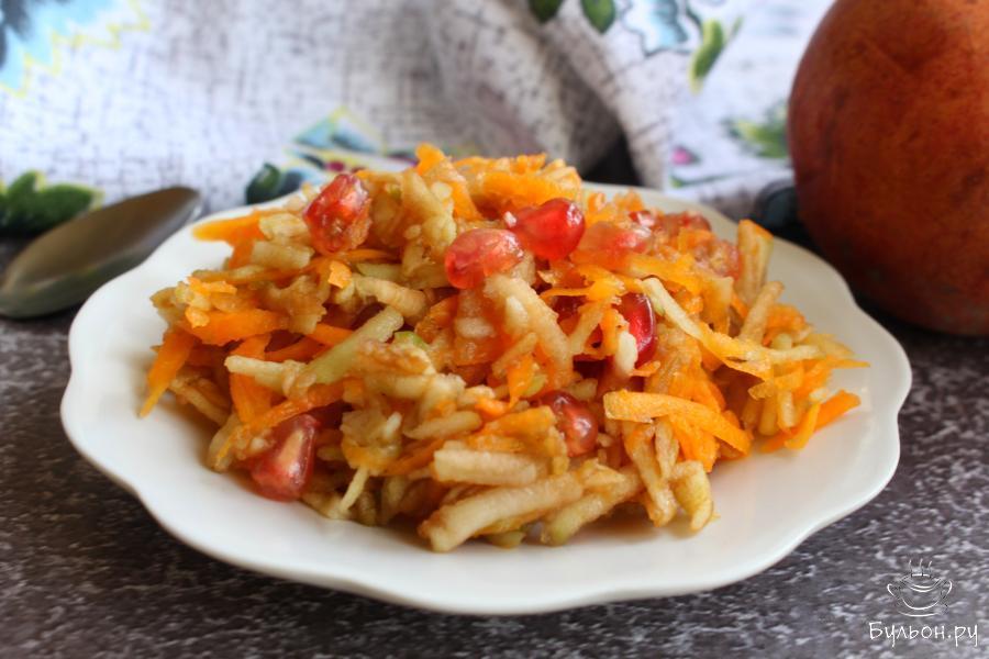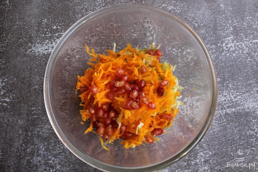 Этот полезный салат из сырой тыквы, яблок и зерен граната отлично подойдет не только для повседневного стола, но еще его можно предложить постящимся и вегетарианцам. Еще салат хорош для разгрузочных дней. Готовится салат за считанные минуты. Салат получается сочный, вкусный, легкий и душистый. Если вам попался не очень удачный гранат (пресный или кислый), то как раз из такого граната и нужно готовить подобные салаты.