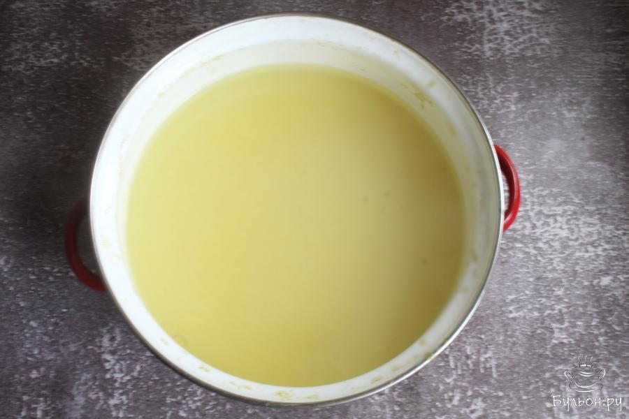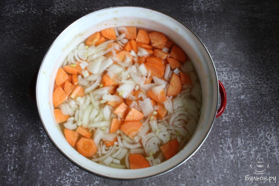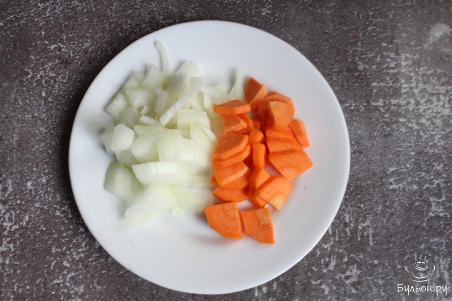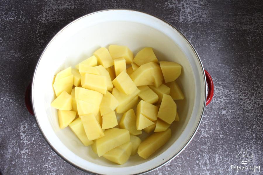 1. Овощи почистить, промыть. Картофель нарезать не очень мелко, выложить в кастрюлю, залить водой. Варить картофель до готовности.