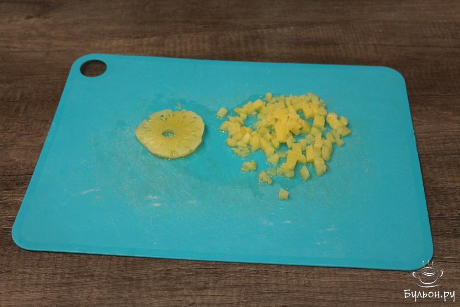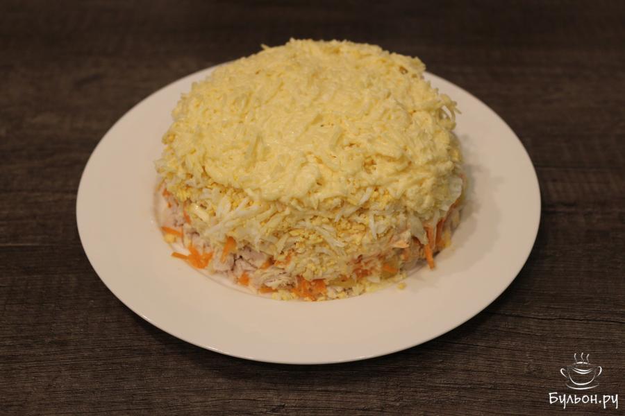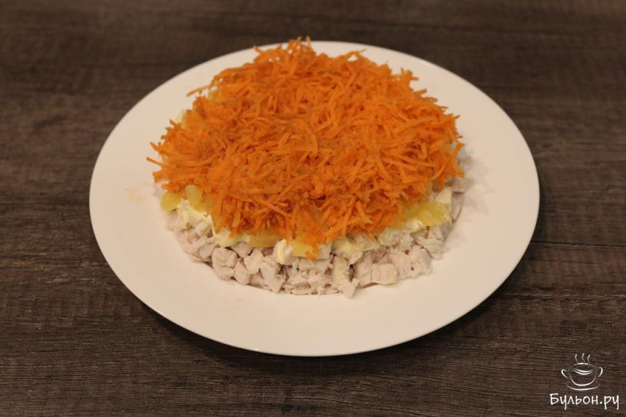 1. Отварите куриное филе, в течение часа, в соленой воде. Затем остудите его. После чего нарежьте на мелкие кубики. Выложите на блюдо. Смажьте майонезом.