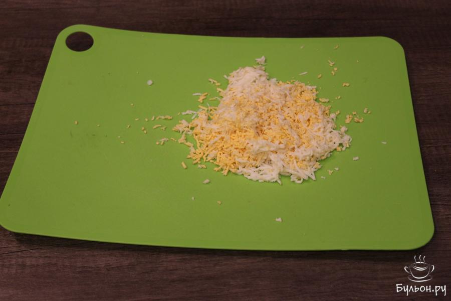 5. Теперь натрите сыр на мелкой терке, смешайте его с измельченным зубчиком чеснока и майонезом. Выложите все это на слой яиц.