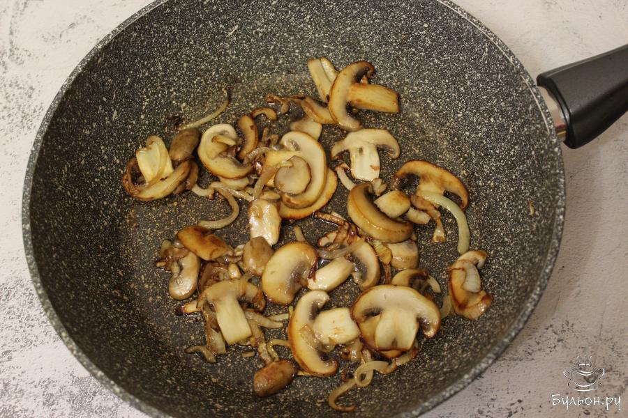 1. Лук нарежьте перьями, шампиньоны ломтиками. Обжарьте нарезанные овощи в сковороде на растительном масле. Затем выложите их на тарелку.