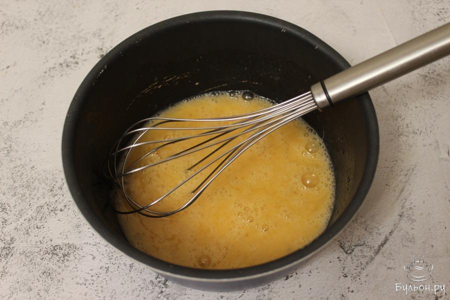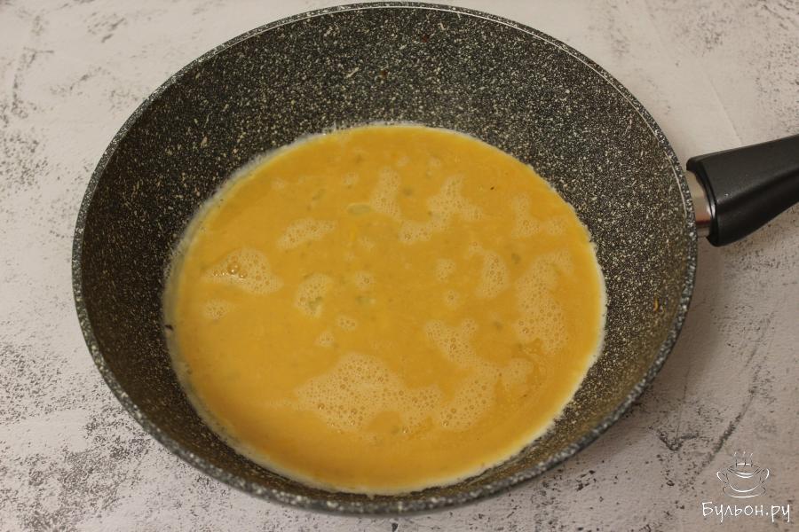3. На той же сковороде, в которой жарились грибы с луком, растопите кусочек сливочного масла, затем вылейте яичную смесь и дайте ей схватиться.
