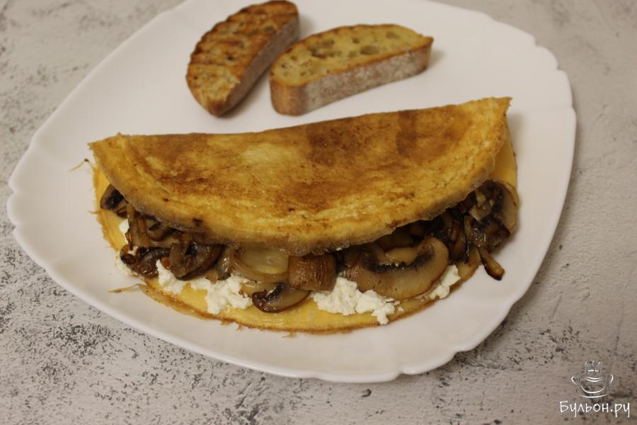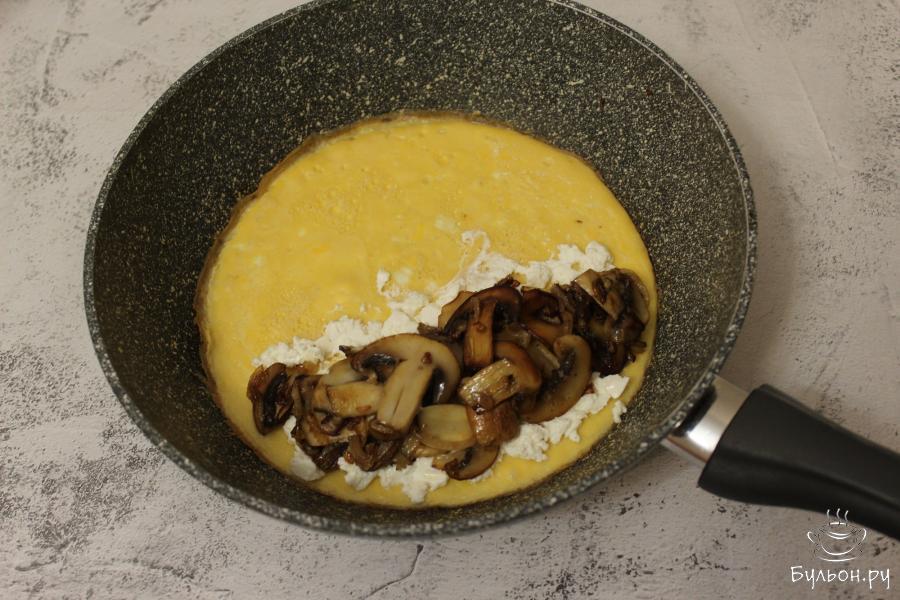 4. На одну половину омлета выложите творожный сыр, сверху выложите обжаренные шампиньоны с луком. Накройте начинку второй половинкой омлета.