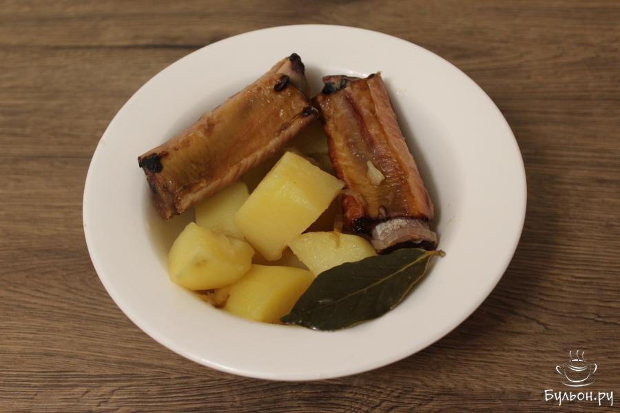 Сегодня я хочу поделится очень простым рецептом вкусного и сытного ужина, а именно, тушенной картошкой со свиными ребрышками. После приготовления мясо с ребрышек будет очень легко сниматься. Свиные ребра можно выбрать, как я, варено-копченные, либо же купить сырые. Это уже дело выбора каждой хозяйки. В данном рецепте использовано минимум ингредиентов, однако вы также можете добавить еще морковку и разные специи по своему вкусу.