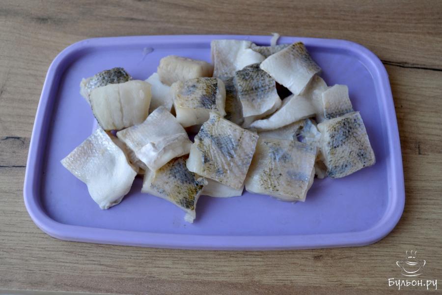 2. Разрежьте тушку вдоль хребта на два филе, позвоночник выбросьте, удалите косточки по возможности. Разрежьте оба филе на кусочки. Посолите кусочки и перемешайте.