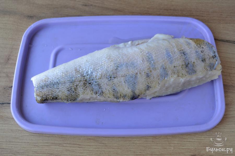 1. У меня небольшая рыбка, чистый вес около 500 граммов. Судака тщательно вымойте и почистите от чешуи. Затем распорите брюшко и удалите внутренности аккуратно, чтобы не повредить желчный пузырь. Отрежьте голову, плавники и хвост. Еще раз промойте.
