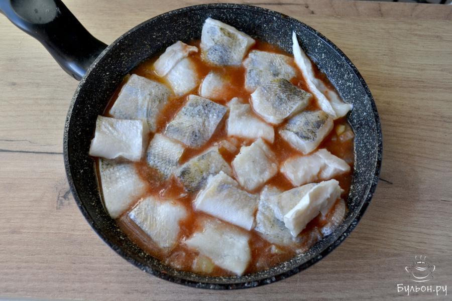 7. Доведите до кипения, сделайте огонь средним и тушите рыбу в течение 8-10 минут. Кусочки рыбы маленькие, за это время они успеют полностью приготовиться.