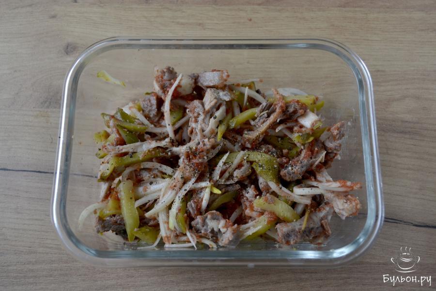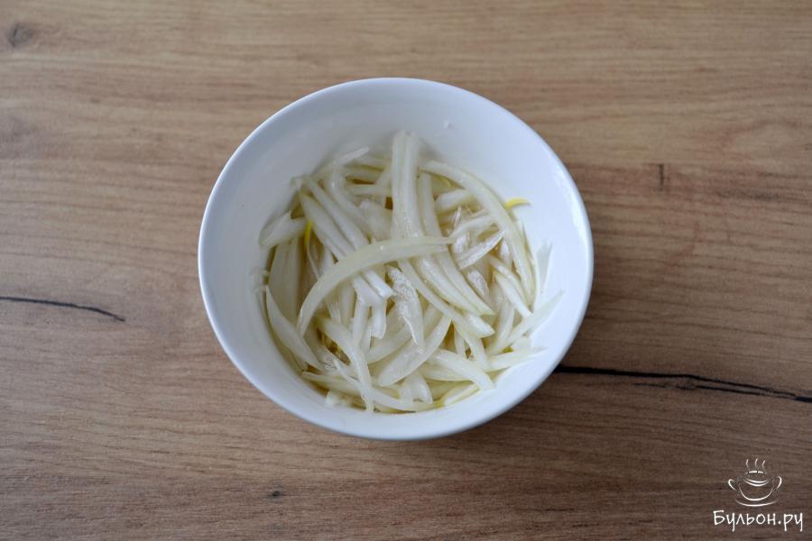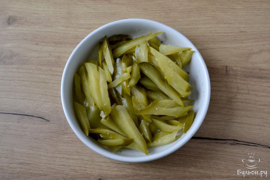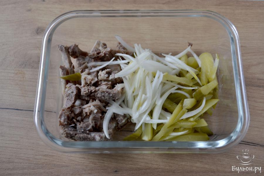 4. В миску сложите нарезанную говядину, огурец и маринованный лук. Можно добавить немного яблочного уксуса, в котором лук мариновался.