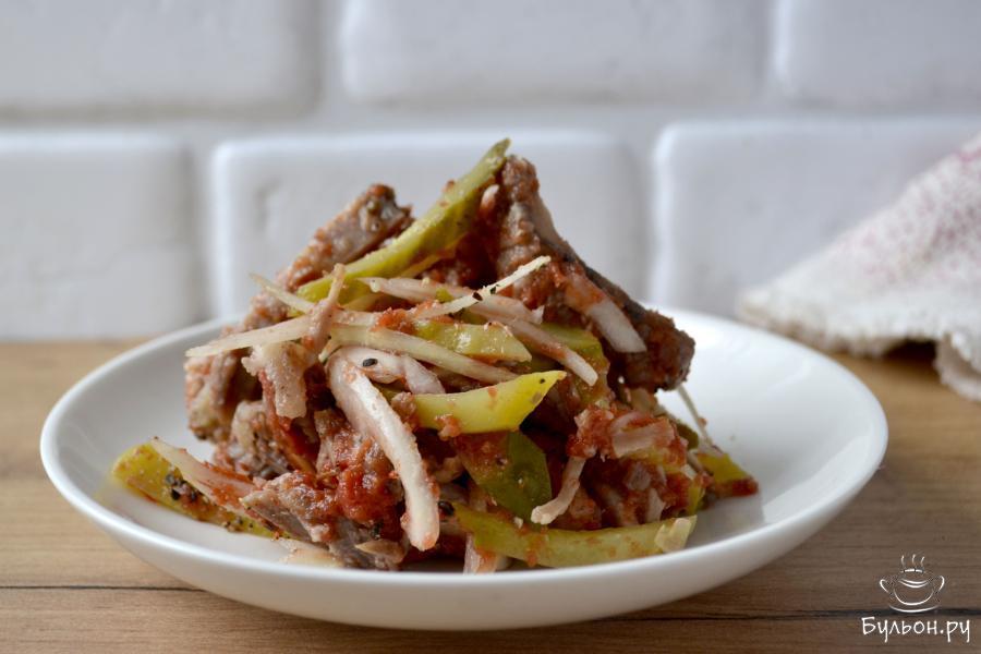Предлагаю приготовить очень вкусный, сытный, мясной салат из вареной говядины, маринованных огурцов, маринованного в яблочном уксусе лука и кетчупа. По вкусу салат получается немного похожим на шашлык. Из минимального набора самых доступных продуктов, получается закуска, которую можно на праздничный стол подать или разнообразить повседневное меню. Быстрота и простота приготовления, а главное вкус, сделали его в числе моих любимых салатов.