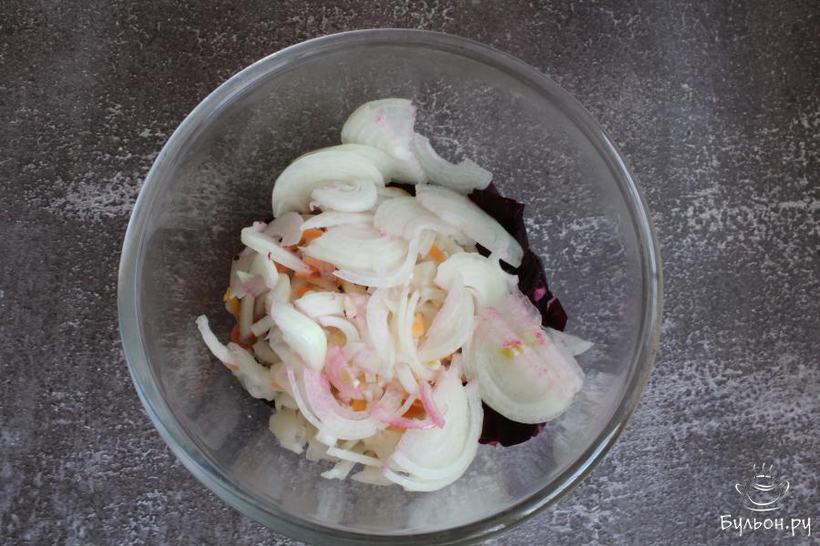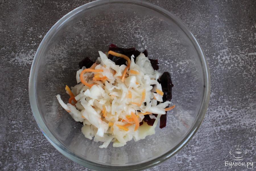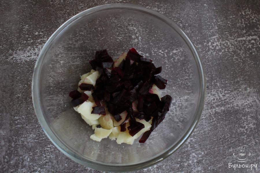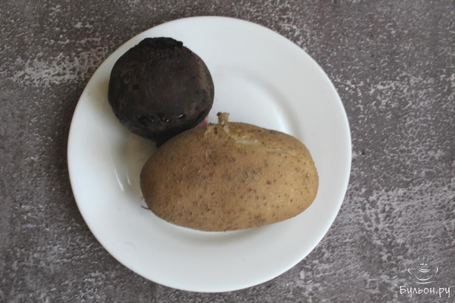 1. Картошку и свеклу промыть, залить водой и сварить до готовности. Картофель варится 20-25 минут, свекла 35-40 минут. Овощи остудить и почистить.