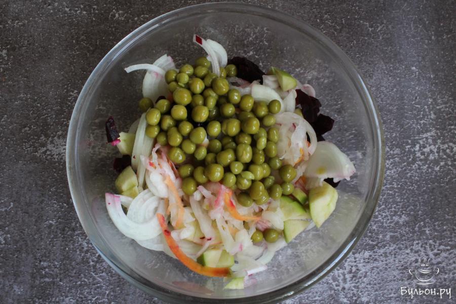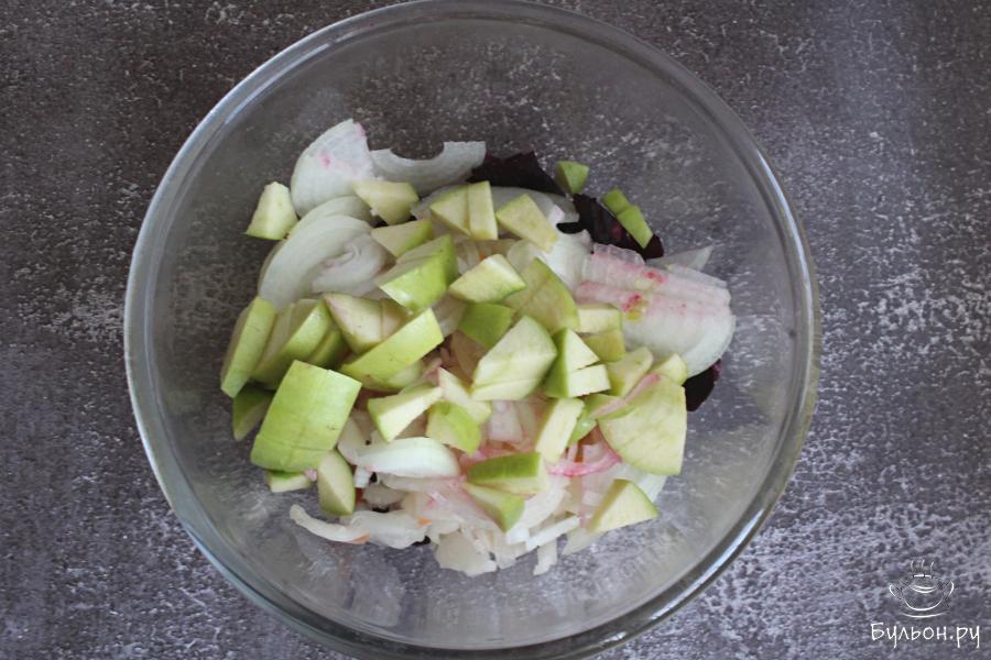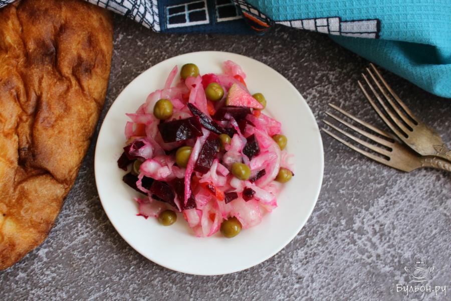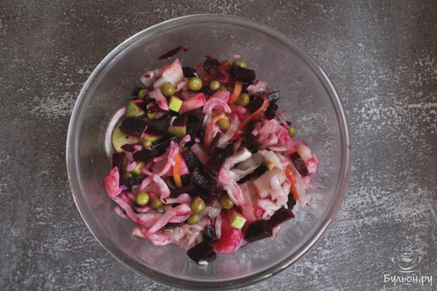 У каждой хозяйки точно есть свой фирменный рецепт винегрета, это салат очень популярный и многими любимый. Сегодня я предлагаю приготовить винегрет с кислыми яблоками без соленых огурцов. Винегрет с яблоками получается необычный, более сочный, освежающий и хрустящий. Это салат легкий, вкусный и он отлично подойдет для постного и вегетарианского меню. Яблоки для приготовления салата берите сочные, хрустящие, кислых сортов.
