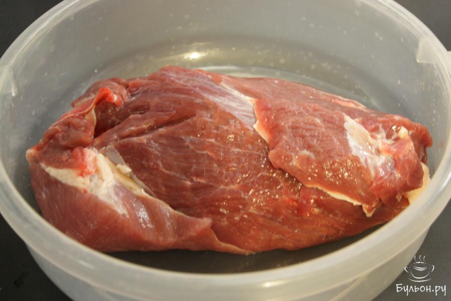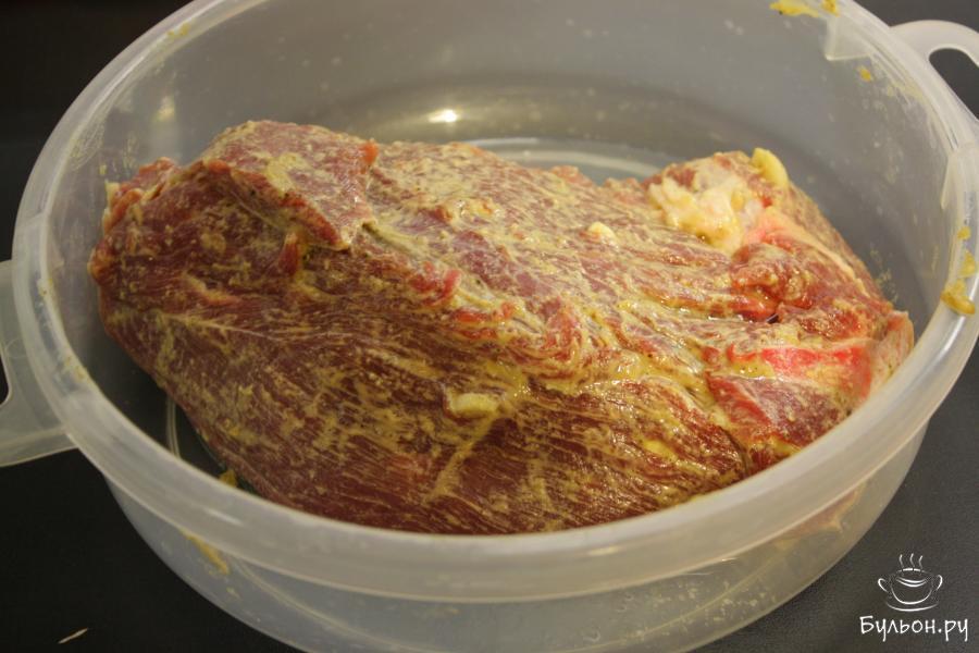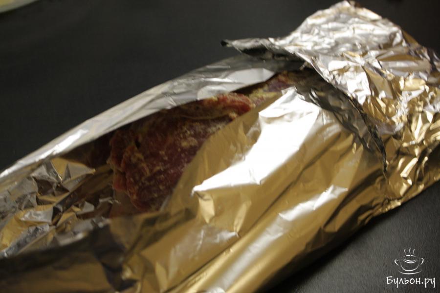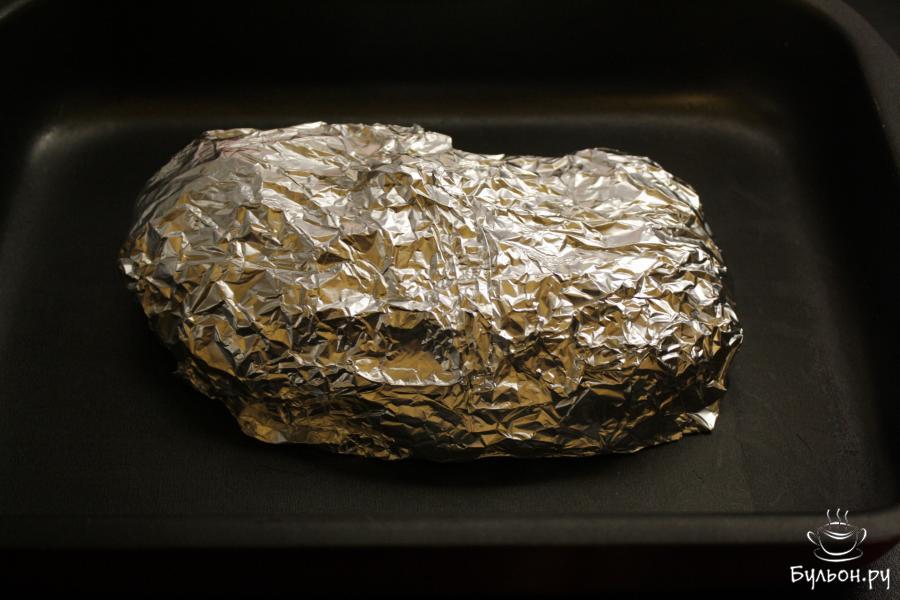 7. Переложить в форму для запекания. Выпекать в разогретой до 200 градусов духовке 50-60 минут. За 10 минут до готовности фольгу нужно приоткрыть, чтобы мясо подрумянилось. Готовое мясо оставить "доходить" в выключенной духовке еще на 5-10 минут, тогда мясо сохранит "мягкость".
