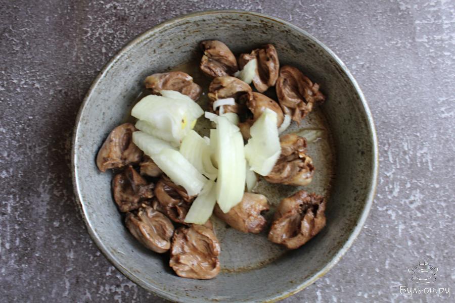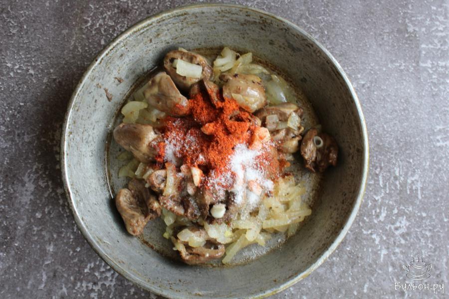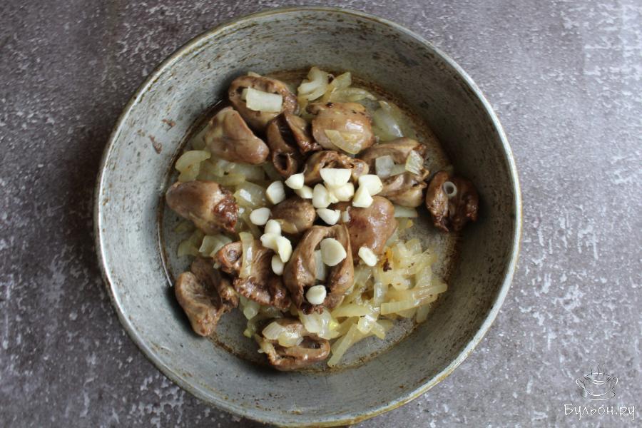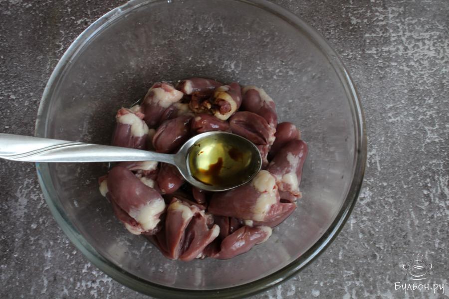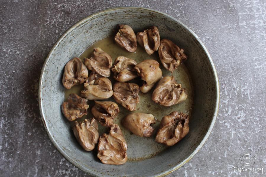4. На сковороде разогреть растительное масло. Выложить сердечки и обжарить их на сильном огне, пять минут, помешивая.