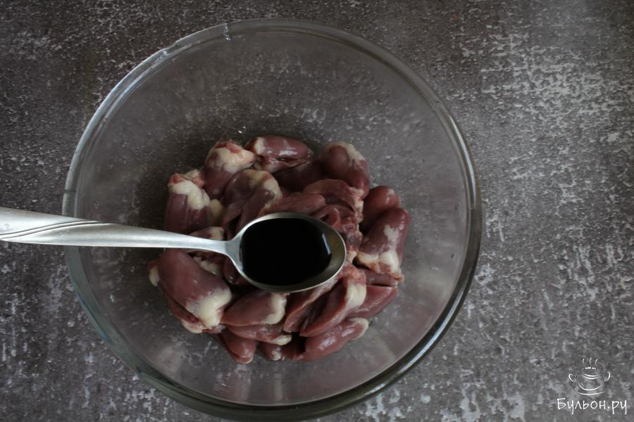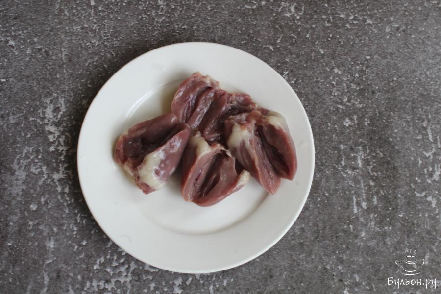 1. Сердечки обработать, срезать верхушку, убрать сгустки крови. Разрезать сердечки вдоль на две части, не разрезая их до конца. Хорошо промыть сердечки.
