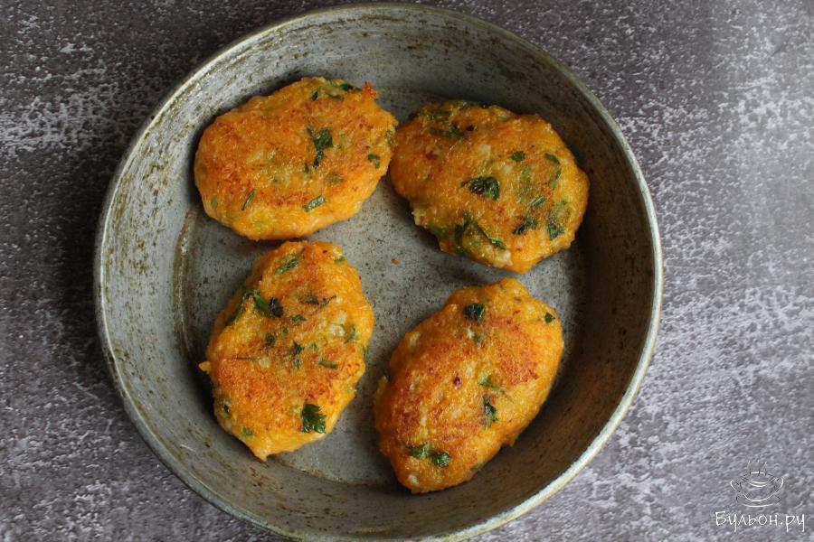 5. Руками формировать котлеты нужного размера и жарить их на сковороде с разогретым маслом. Жарить котлеты с двух сторон, по несколько минут, до румяной корочки.