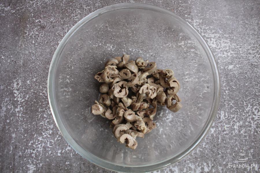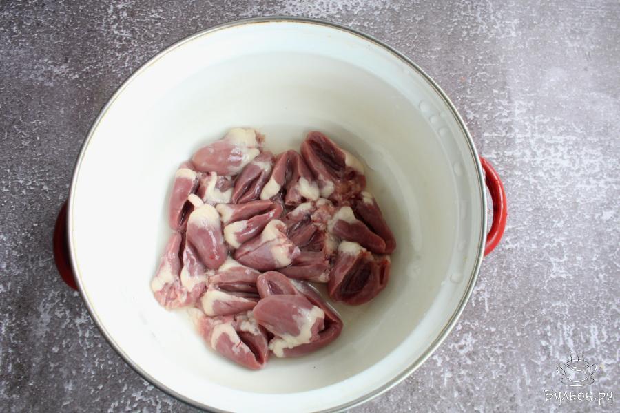 1. У сердечек немного срезать верхушки с сосудами, разрезать сердечки вдоль не разрезая сердечки до конца. Тщательно промыть сердечки, убрать сгустки крови. Залить сердечки водой и варить их 20 минут после закипания воды.