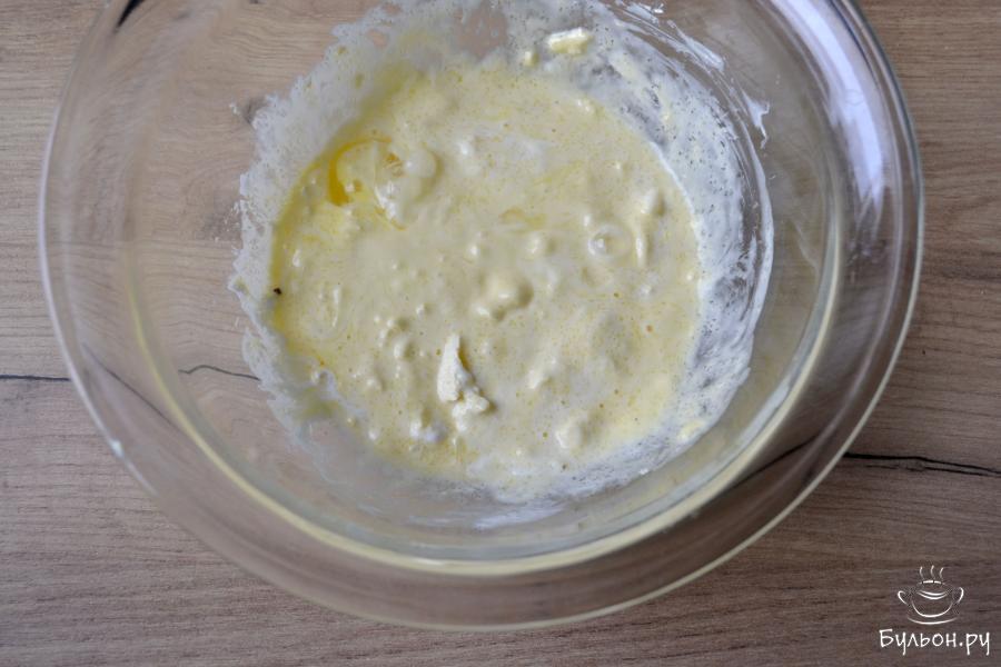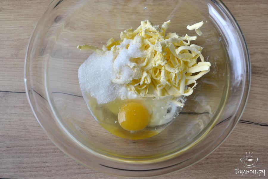 1. В миску для теста положите сметану, натрите на крупной терке маргарин, разбейте яйцо, добавьте сахар и щепотку соли.