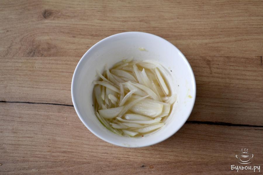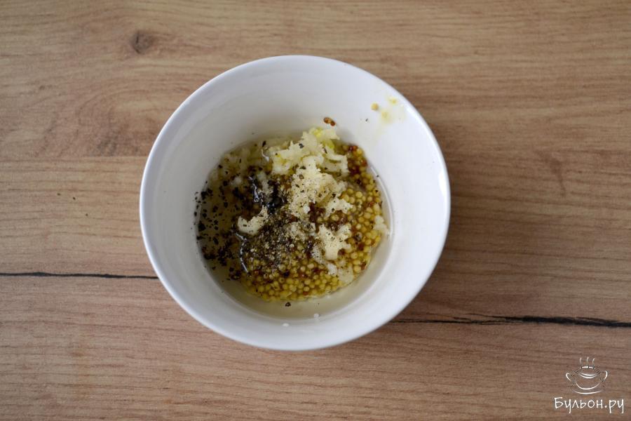 4. В мисочке соедините зернистую горчицу, растительное масло, перец черный молотый, пропущенный через пресс чеснок.