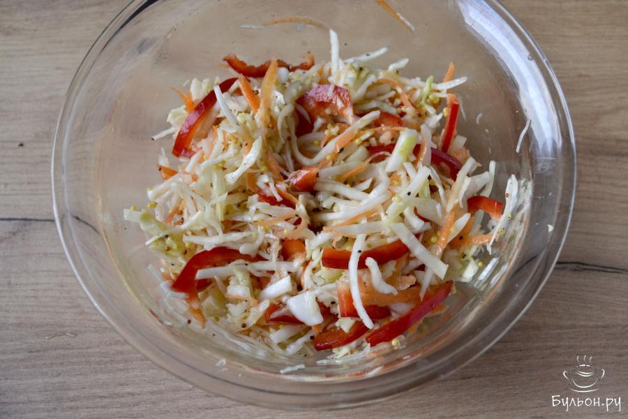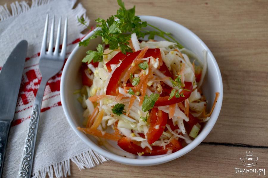Во время Поста, да и не только, можно приготовить овощной салат из капусты, сладкого болгарского перца, моркови, маринованного в натуральном, яблочном уксусе лука и масляно-горчиной заправке. Салат получается очень вкусный, сочный, полезный, пикантный. Количество продуктов можно менять по вкусу: можно взять больше перца или моркови, а капусты меньше. Салат в любом случае очень аппетитный, разжигающий аппетит. Если вы не поститесь, то салат хорошо подать к любому мясному блюду.