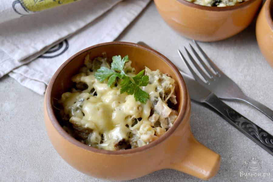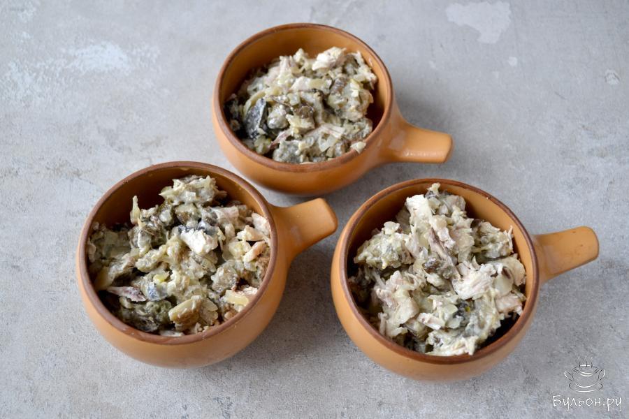 По сути, жульен - это запеканка. Совсем не обязательно использовать для приготовления кокотницы - маленькие порционные формочки. Можно запечь в одной форме, а потом разделить на порции. Для жульена нужно обжарить лук с грибами, добавить вареное и нарезанное куриное мясо. Лучше взять голени или бедрышки, а не грудку, у которой довольно сухое мясо. Потушить продукты со сметаной или сметану развести водой, можно использовать сливки. Тушеные продукты переложить в кокотницы и запечь. Аппетитная шапочка жульена получится, если посыпать курицу с грибами тертым сыром.