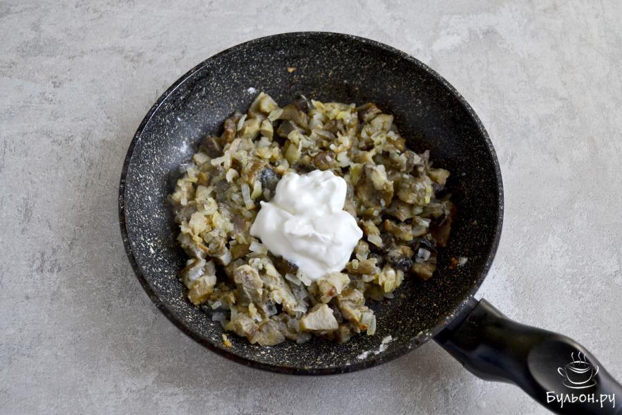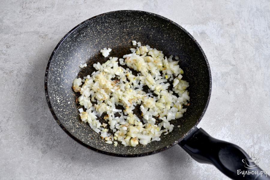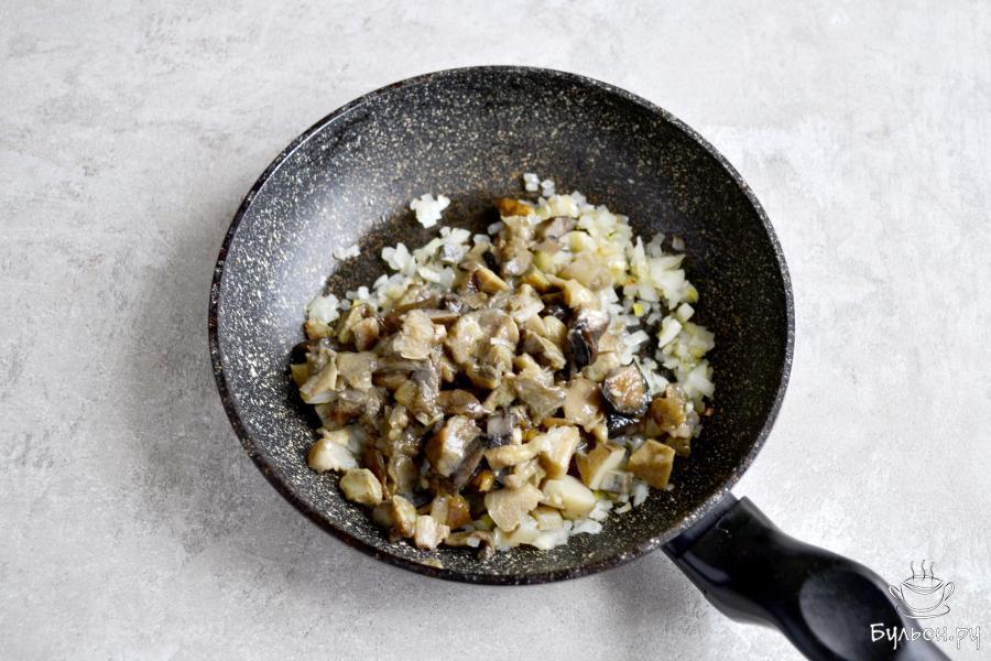 2. Добавьте к луку мелко нарезанные отварные, лесные грибы. Грибы у меня вареные замороженные. Грибы нужно полностью разморозить и слить всю жидкость. Затем мелко нарезать.