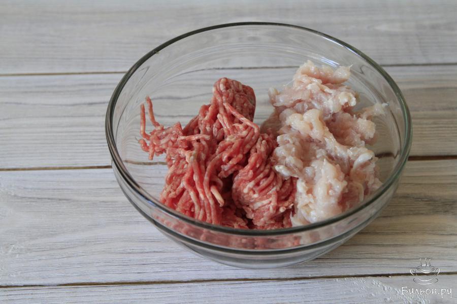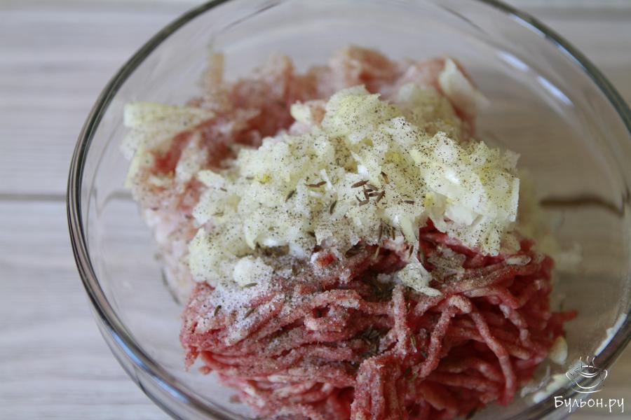 4. Репчатый лук измельчить. Добавить в фарш специи и соль по вкусу. Все ингредиенты хорошо перемешать.