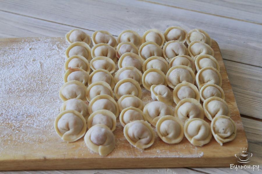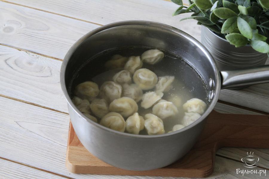 8. Готовые пельмени использовать по назначению. Их можно заморозить или отварить. Если планируете подавать сразу к столу, то необходимо будет вскипятить воду. Как только вода закипит, посолить и забросить пельмени. Для вкуса добавить черный перец горошком и лавровый лист. Варить пельмени 12-15 минут.