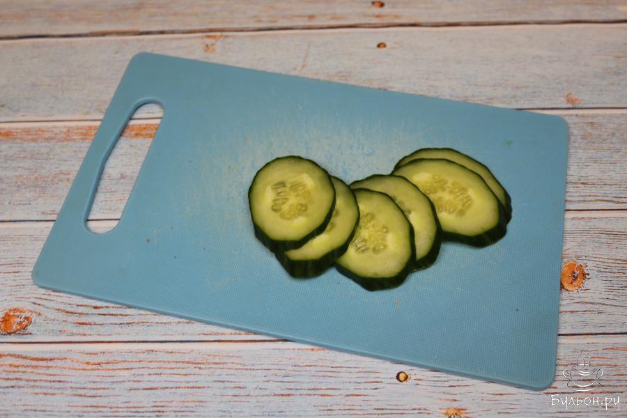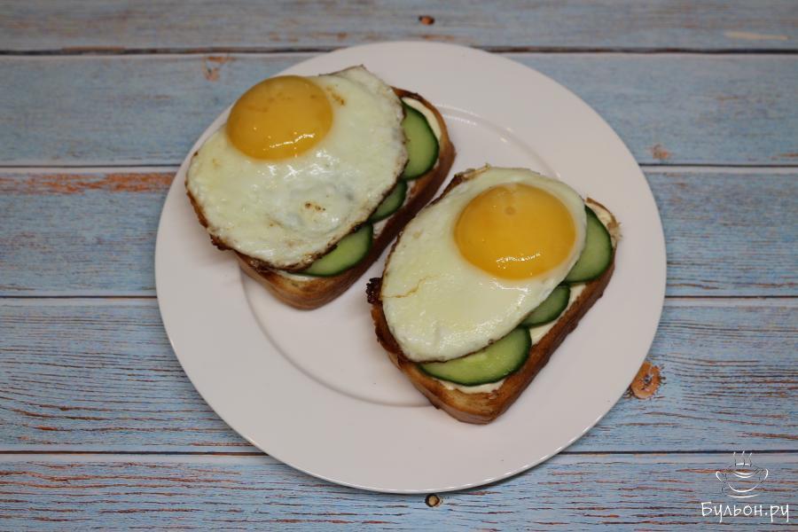 6. На каждый бутерброд выложите по три кусочка огурца, сверху положите по яичницы-глазуньи. Бутерброды готовы, можно подавать к завтраку.
