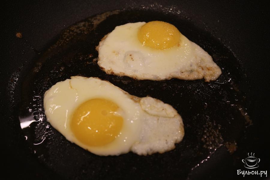 4. Также, на сливочном масле обжарьте яичницы-глазуньи, аккуратно разбив яйца, чтобы желток не растекся. Посолите.