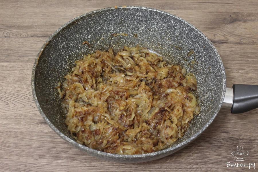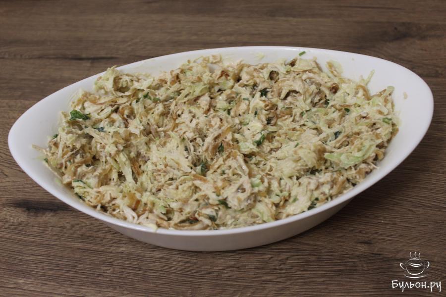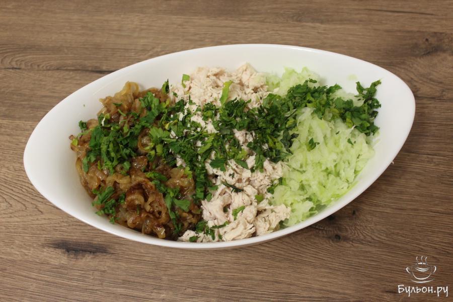 4. Редьку хорошо отожмите от сока и переложите в салатник. Добавьте в салатник курицу, жареный лук и рубленную зелень.