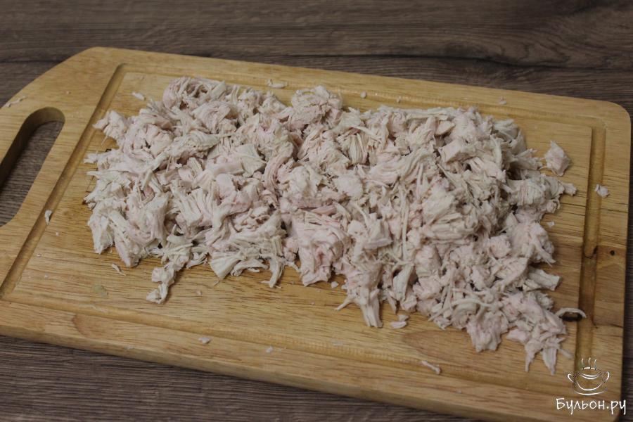 1. Отварите куриное филе в чуть подсоленной воде. Готовую отварную курицу остудите и разберите на волокна.