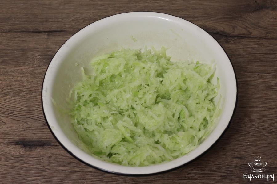2. Очистите редьку, натрите ее на крупной терке, переложите в миску, посолите и перемешайте руками. Отставьте в сторону минут на 15.