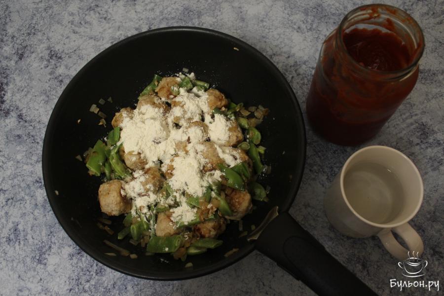 3. Присыпьте фрикадельки с овощами пшеничной мукой, перемешайте. Залейте кипяток, добавьте томатную пасту, посолите и хорошо перемешайте. Потушите фрикадельки под закрытой крышкой.