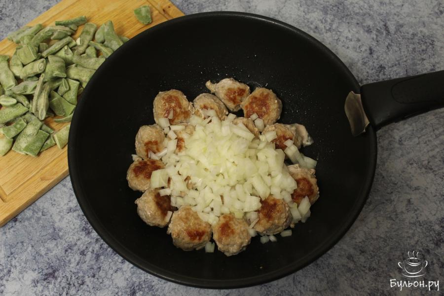 2. Нарежьте оставшуюся луковицу кубиками и переложите в сковороду к фрикаделькам. Перемешайте и слегка обжарьте. Затем добавьте стручковую фасоль и еще немного обжарьте.