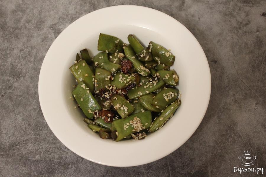 5. В конце приготовления добавьте кунжут, перемешайте и жарьте еще 2 минуты. Готовую стручковую фасоль можно подавать на стол как в горячем, так и в холодном виде.
