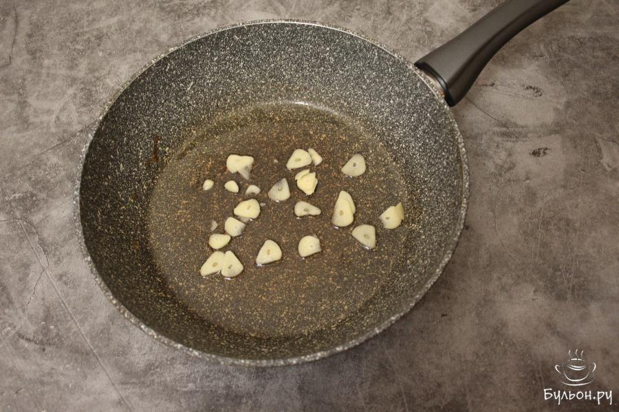 3. В сковороде растопите сливочное масло, добавьте растительное и на этих маслах обжарьте пластинки чеснока до появления чесночного аромата.